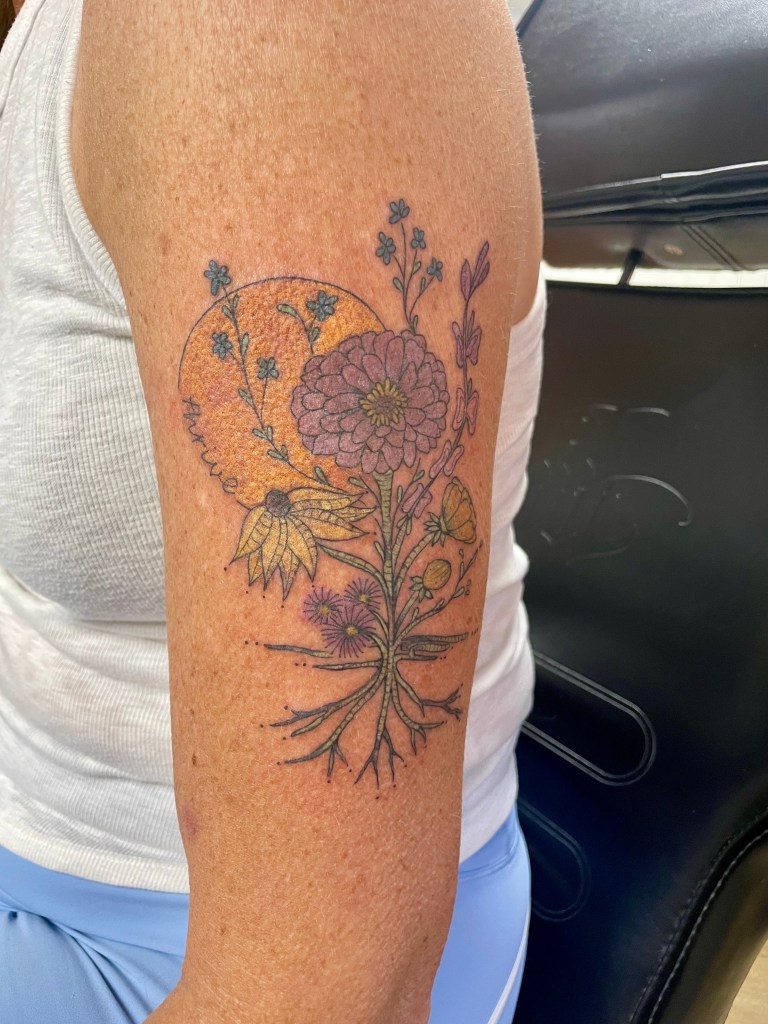 A few years back, David completed the Rim to Rim hike in the Grand Canyon, and quickly befriended Lillian. As the owner, creator, and artist behind her company ‘Of the Valley’, Lillian is a brilliant woman. She is one of the most genuinely kind, down to earth, and lovely humans I’ve ever met. I asked Lillian to help me design my tattoo, and she ABSOLUTELY KNOCKED IT OUT OF THE PARK! Thanks to her amazing interview process, detailed research, compassionate demeanor, and mind blowing talent, she lovingly conceived and drew the design, as well as compiled the following statements surrounding each element in the tattoo. (Ironically enough, I have each of these flowers growing somewhere in my yard. Or, is it ironic???)